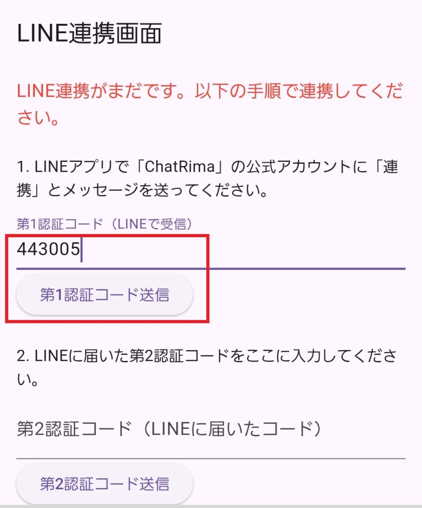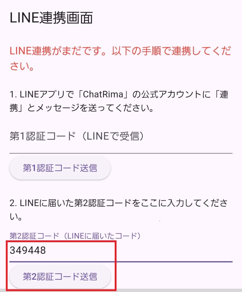 ChatRima アプリの「LINE連携」画面で、第2認証コードを入力して送信します。