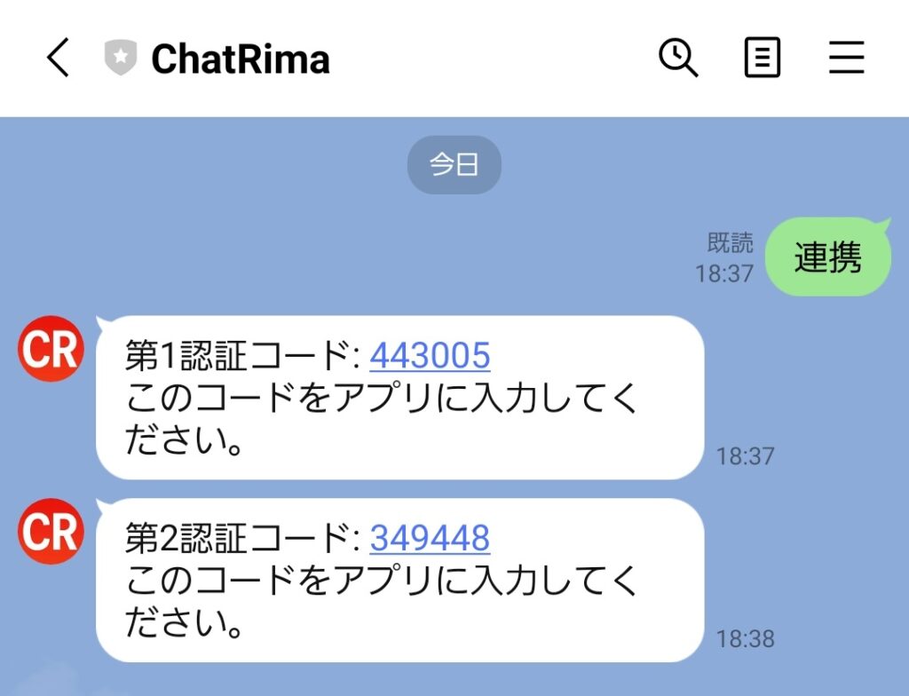 しばらくすると、LINE に 第1認証コード が届きますので、 ChatRima アプリの「LINE連携」画面で第1認証コードを入力して送信します。